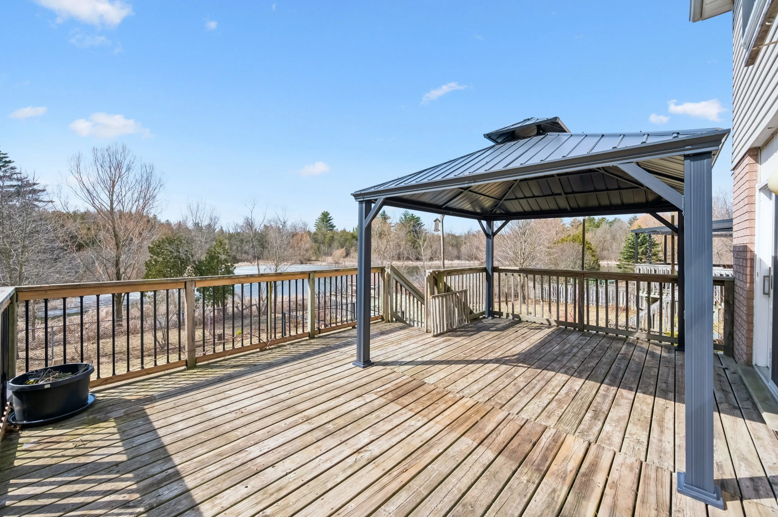 The expansive deck is perfect for summer barbecues or quiet evenings overlooking the water and surrounding nature.